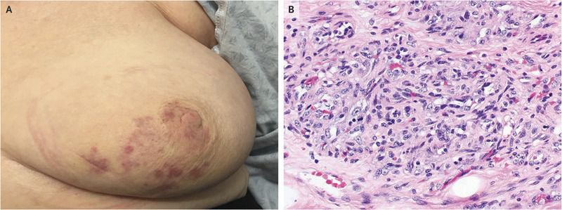A 72-year-old woman presented with skin changes on her left breast; 5 years earlier, she had undergone lumpectomy and radiation therapy for breast cancer. Physical examination revealed an area of skin 10 cm in diameter, medial to the areola, that had an ecchymotic appearance (Panel A). The area contained no underlying mass or nodular tissue. Punch biopsy findings were consistent with angiosarcoma. She underwent mastectomy, and final pathological testing revealed a grade 2 angiosarcoma larger than 10 cm that involved the dermis and breast parenchyma (Panel B). Radiation-induced angiosarcoma is a rare complication after breast-cancer treatment. Patients frequently present with asymptomatic skin changes, which can be difficult to differentiate from radiation-induced skin changes. Angiosarcomas may also manifest as cutaneous or subcutaneous, flat or nodular, or localized or multifocal lesions and can have an appearance similar to that of benign angiomas or atypical telangiectasis. Aggressive surgery is the standard of care and usually involves mastectomy to obtain wide margins. Recurrence rates are high, and the benefits of adjuvant therapy are unclear. The patient underwent scanning to stage the cancer, and the results showed no metastatic disease. She then underwent chemotherapy, and at 1-year follow-up, she had no evidence of disease.