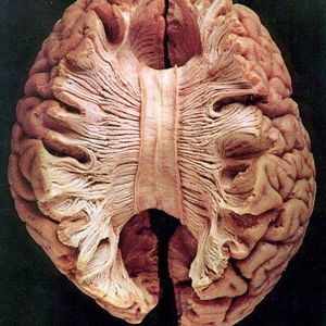 The Corpus Callosum :) Corpus callosum is Latin word for "tough body", and it is a wide, flat bundle of neural fibers beneath the cortex in the eutherian brain at the longitudinal fissure. It connects the left and right cerebral hemispheres and facilitates interhemispheric communication. It is the largest white matter structure in the brain, consisting of 200–250 million contralateral axonal projections.