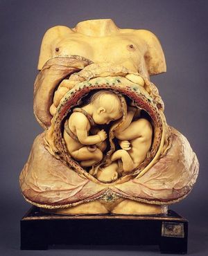 An Amazing Anatomical Model from 18th century, showing the inside of a Pregnant woman with the upper layers of abdomen dissected.