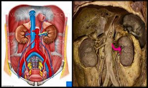 This is the left renal artery, seen on a dissection and a professional anatomical illustration (highlighted in yellow). The renal arteries are super important for keeping our kidneys supplied with blood.