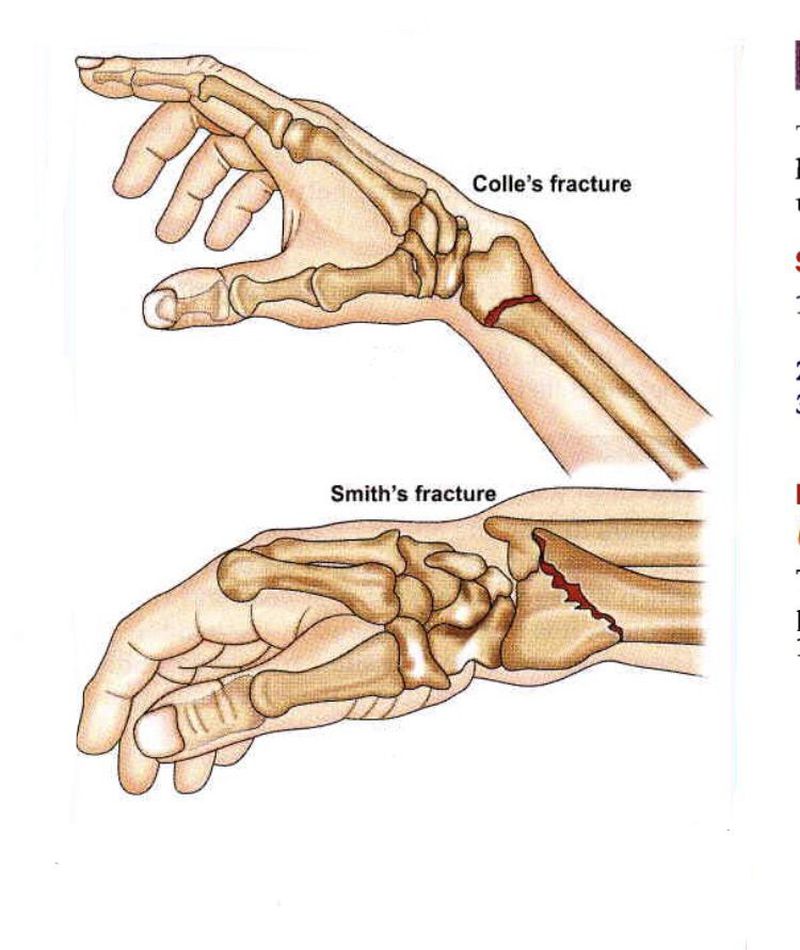 The radius commonly gets fractured about 2 cm above its lower end (Colles'fracture). This fracture is caused by a fall on the outstretched hand. The distal fragment is displaced upwards and backwards, and the radial styloid process comes to lie proximal to the ulnar styloid process. (It normally lies distal to the ulnar styloid process.) If the distal fragment gets displaced anteriorly, it is called Smith's fracture