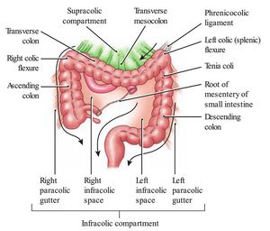 Supracolic compartment, infracolic-•right paracolic gutter/canal•right infracolic space•left infracolic space•right paracolic gutter/canal