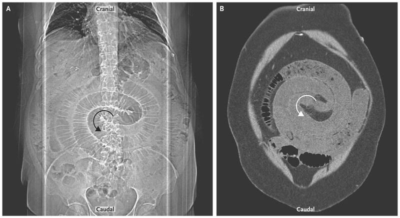 A 56-year-old man presented after a day and a half of midabdominal pain, nausea, and bilious emesis. The patient had undergone Roux-en-Y gastric bypass 7 years earlier. During the physical examination, tachycardia and tachypnea were noted. The abdominal examination showed a distended, tympanic abdomen with severe generalized abdominal tenderness, involuntary guarding, and rebound tenderness consistent with peritonitis. Radiography (Panel A) and computed tomography (CT) (Panel B) showed dilated loops of small bowel distal to the jejunojejunostomy staple line with proximal decompression. Swirling of the bowel and mesenteric vessels was noted on CT as they herniated through the jejunojejunostomy mesenteric defect. Exploratory laparoscopy showed an internal hernia of the small bowel. The herniation was reduced and the defect closed. Small-bowel obstructions associated with internal hernias after gastric bypass can progress to bowel necrosis and death. The patient’s postoperative course was uncomplicated, and he was discharged home on postoperative day 2.