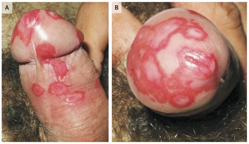 A 37-year-old man presented to the emergency department with a 7-day history of genital lesions. He also had weight loss (approximately 4 kg), fatigue, and back pain but no gastrointestinal symptoms. Two months before presentation, he had had dysuria and urethral discharge, both of which resolved spontaneously. He took no medications on a regular basis, and his medical history was unremarkable. Physical examination revealed erythematous, well-demarcated annular plaques on the glans penis and meatal inflammation (Panels A and B). He also had conjunctival injection in both eyes. The patient had a positive test result for infection with the human immunodeficiency virus (HIV), with a viral load of 15,000 copies per milliliter. His CD4 T-cell count was 172 per microliter. A test for rheumatoid factor was negative, and a test for HLA-B27 was positive. A serum sample was obtained to evaluate the patient for infection with hepatitis B virus, hepatitis C virus, and syphilis; the test results were negative. Infection with Chlamydia trachomatis was detected on nucleic acid amplification testing with a sample from a urethral swab. A single oral dose of 1 g of azithromycin was administered, and antiretroviral therapy was started. During the next month, the circinate balanitis persisted. Topical tacrolimus 0.1% was administered, and the patient had complete remission within the next 10 days.