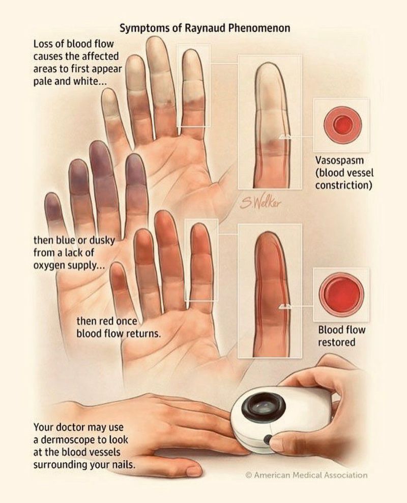 Raynaud's phenomenon is a type of vascular disease characterized by a pale to blue to red sequence of color changes of the digits, most commonly after exposure to cold. Raynaud's phenomenon occurs because of spasm of blood vessels. The cause of Raynaud's phenomenon is unknown, although abnormal nerve control of blood-vessel diameter and nerve sensitivity to cold are suspected of being involved. Symptoms of Raynaud's phenomenon depend on the severity, frequency, and duration of the blood-vessel spasm. There is no blood test for diagnosing Raynaud's phenomenon. Treatment of Raynaud's phenomenon involves protection of the digits, medications, and avoiding emotional stresses, smoking, cold temperature, and tools that vibrate the hands.