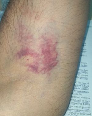 A 22 yr old patient complaining of dark reddish brown patch around the site of needle prick after a blood donation of 450 ml with slight tender around it...... appears 11 hr after donation of blood.........