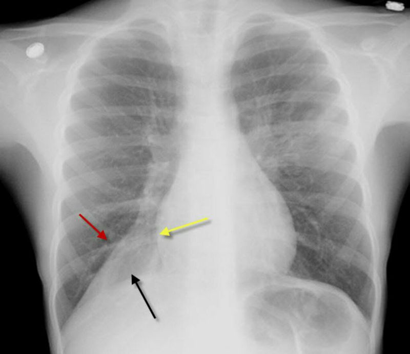 CXR shows Right Lower Lobe (RLL) Atelectasis In this graphy there is a triangular or wedge-shaped density at the right lung base medially (black arrow) that displaces the major fissure inferiorly (red arrow), obscures the right hemidiaphragm and maintains the shadow of the right heart border (yellow arrow).