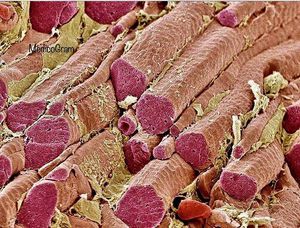 Here you can see what allows you to move :) Endomysial connective tissue is yellow, the fibers are red.The fibers contain series of proteins (actin and myosin) that contract, and the addition of thousands of these micro-contractions lead to a big contraction of the whole muscle.Without these guys you wouldn't even be able to breath!