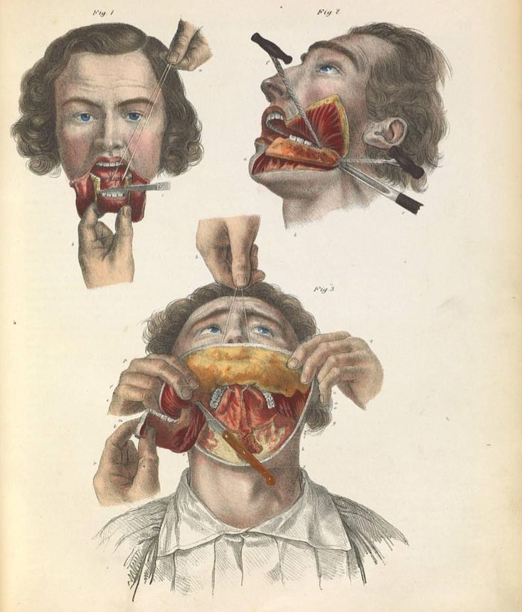 An illustration of a surgical operation demonstrating the removal of a malignant tumor located in the lower jaw.Remember, previously these procedures used to be done with no analgesics or antibiotics!