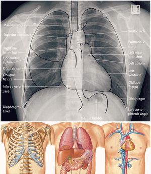 The chest houses organs such as the heart, esophagus, trachea, lungs, and thoracic diaphragm. The heart circulates blood from around the body to the lungs, where the blood receives oxygen from capillaries.