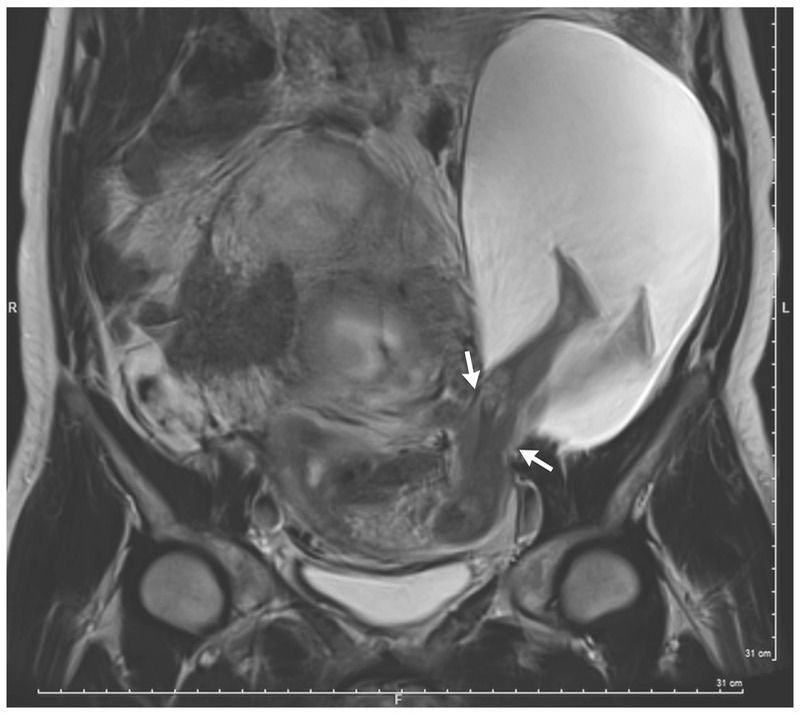 A 33-year-old asymptomatic woman (gravida 6, para 5) presented at 22 weeks of gestation with a large herniation of the amniotic sac through the left uterine wall that was detected by routine ultrasonography. She had had five previous cesarean sections through a transverse incision of the lower uterine segment and no previous vaginal deliveries. Magnetic resonance imaging revealed a 2.5-cm rupture of the left uterine wall (arrows) and a large amniocele that measured 19 cm by12 cm by 9 cm and contained fetal legs. The patient and her partner were informed of the potential risks of these findings, including complete uterine rupture, placenta accreta, hysterectomy, and preterm birth. They opted to proceed with the pregnancy with close monitoring. Repeat ultrasonography at 30 weeks of gestation revealed that the uterine dehiscence had extended 5 cm and the herniated sac had grown and included the fetal abdomen and legs. At 30 weeks of gestation, a healthy male newborn weighing 1385 g was delivered by cesarean section. After the delivery, the left posterior uterine rupture and large amniocele were identified and repaired. The patient had an uncomplicated postoperative course and was discharged from the hospital 5 days later. At 6 months of age, the baby was alive and well.