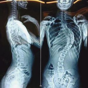 Here is a very interesting radiograph showing a case of scoliosis and dextrocardia.Scoliosis is an abnormal lateral curvature of the spine.Dextrocardia is a rare heart condition in which the heart points toward the right side of the chest instead of the left side.