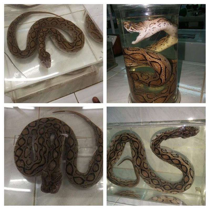 Triangular shaped head with a 'V' shape mark, well defined neck, short and stumpy body, three rows/ chains of large spots along the body. Classified as true vipers (no pits) Highly venomous, front movable fang
