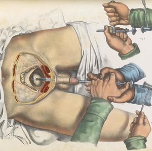 This is an illustration demonstrating the surgical technique of lithotripsy (Removal of stones) in 1841.