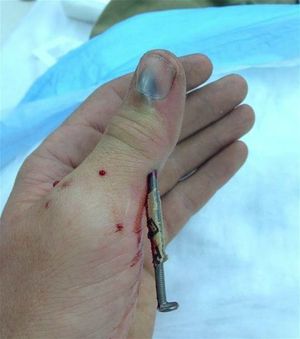 Treatment of a retained nail following nail-gun injury adheres to standard principles of wound management. A single dose of intravenous or intramuscular antibiotics is often administered, usually a first-generation cephalosporin to cover skin flora contamination in uncomplicated cases. Regional blocks are usually sufficient for wound exploration and debridement. The wound and surrounding soft tissues are thoroughly irrigated with isotonic sodium chloride solution with or without the addition of antimicrobial agents. Exploration for removal of foreign material and to avoid secondary injury from nail extraction should be considered.
