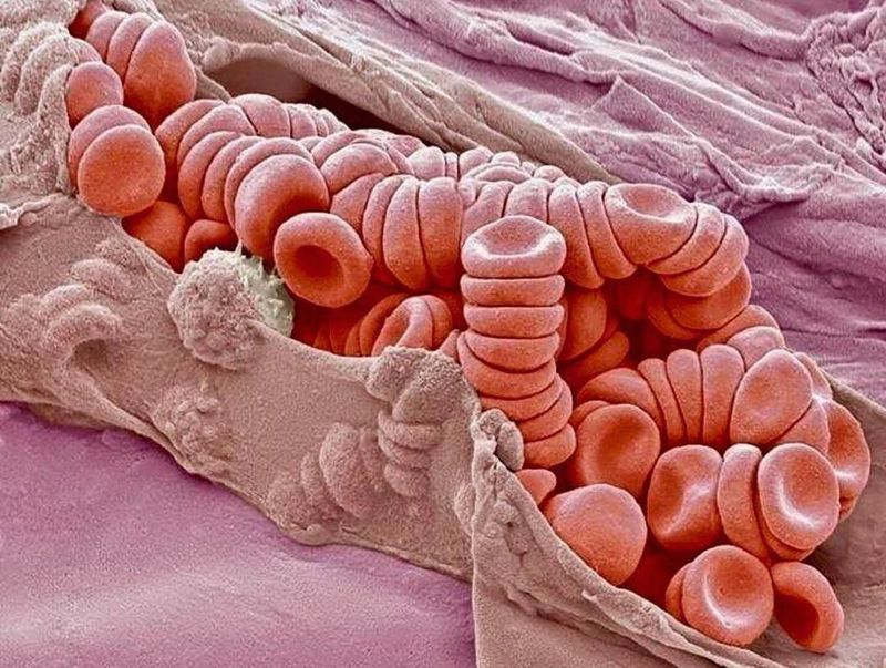 Wow, this is how a ruptured venule looks like under a magnified microscope.Shown here is a colored scanning electron micrograph (SEM) showing stacks (rouleaux) of red blood cells exposed inside a torn venule.A venule is a very small blood vessel in the microcirculation that allows deoxygenated blood to return from the capillary beds to the larger blood vessels (veins). Red blood cells are the most abundant cell in the blood. They have no nucleus and are about 7 micrometers across. Magnification: x2300 when printed at 10 centimetres wide.