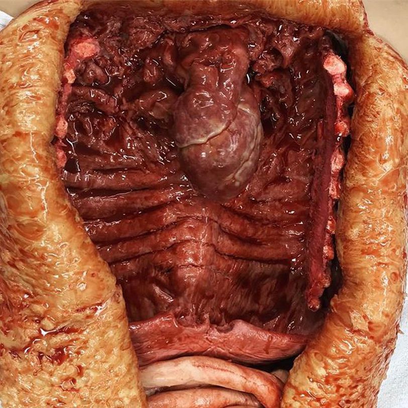 Interesting picture of an interior of autopsy body. Here you can see the heart, with the ribcage, lungs, esophagus, stomach and liver removed.