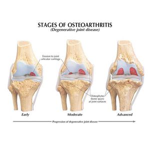 Osteoarthritis is a degenrative joint disease, it is the most common chronic arthritis of the joint. The causes of arthritis could be obesity, injury to the joint or even genetic. It also can be secondary to other diseases such as rheumatoid arthritis or hemochromatosis. The most common symptoms of OA are stiffness of the joint early in the morning and pain. Treatment is by medication for stages 1-3 (Mild to moderate), stage 4 (Advanced) is an indication for knee replacement or surgery.