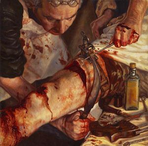 Don't panic! It is just a painting showing how they used to do amputations in the past. In this picture the surgeon is using a falciform amputation knife to cut off the flesh before amputating the bone. Remember all these procedures were done without anesthesia.