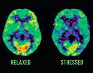 Notice the difference between a relaxed brain and a stressed one.Stress is how the body react to challenges or stressors. Stress is a medical term for a wide range of strong external stimuli, both physiological and psychological, which can cause a physiological response called the general adaptation syndrome.Stress activates the sympathetic branch of the autonomous nervous system and the release of stress hormones including epinephrine, and cortisol. Sympathetic nervous output produces the fight-or-flight response, causing the body to divert the normal bloodflow. Less blood flows to the digestive system and other organs that do not assist in the stress condition, producing dry mouth, motor agitation, sweating, pallor, enlarged pupils and over the long term, insomnia. Stress is overcomed when the parasympathetic branch gets activated reversing the effects of sympathetic nervous system.