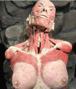 Model of a female showing the anatomical structures and muscles of the face, neck and chest.