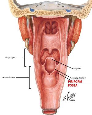 It is a deep recess broad above and narrow below in the anterior part of lateral wall of the laryngopharynx on each side of the laryngeal inlet.... It is sometimes artificially deepened by smugglers using lead balls to hide precious materials like diamonds..For this reason piriform fossa is also called as Smugglers fossa The ingested foreign bodies like pins or fish bones are sometimes lodged into the piriform fossa.If care is not taken the removal of foreign bodies may damage the internal laryngeal nerve leading to anesthesia in the supraglottic part of the larynx and subsequent loss of protective cough reflex....