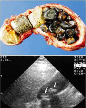 These are images of different patients suffering from cholelithiasis (defined as the presence of calculi (gallstones) within the gallbladder). The gross picture shows several different types of gallstones found within the gallbladder, the yellow gallstones consists of cholesterol whereas the outer greenish-brown stones are composed of biliverdin and stercoilin. The ultrasound picture shows stones (Hyperechoic) indicated with white arrows.Gallstones are of two types, cholesterol stones and pigmented stones. Cholesterol stones are more common up to 80%, risk factors for them are the 5Fs: Fat, Female, Forty, Flatulent, Fertile, oral contraceptives, crohn's disease, and north American Indian ancestry. Pigmented stones are either black or brown in color, they are calcium based, risk factors for them are cirrhosis, biliary stasis (strictures, dilation, biliary infection), and chronic hemolysis. Gallstones are usually asymptomatic(80%) but if the symptoms are present they are composed of biliary colic, steady, severe dull pain in epigastrium or RUQ for minutes to hours, crescendo-decrescendo pattern, frequently after fatty meal or at night, nausea, and/or vomiting. Evaluation is by ultrasound which is the test of choice of gallstones disease, radiographs can differentiate between cholesterol stones which are radiolucent (Black) from the pigmented stones which are radiopaque (White).Treatment of gallstones is cholecystectomy (Removal of the gallbladder). Complications of cholelithiasis are cholecystitis, acute pancreatitis, gallbladder cancer, choledocolithiasis, and fistula.