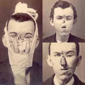 Shown here in the right upper picture a deformity called saddle nose which is flattening of the nose as it merges with the face, this deformity was commonly seen in syphilis.This is a historical picture shows how they used to do a surgery before the time of penicillin. In the left picture they attach the middle finger to the nose and leave it for several weeks, then the middle finger gets amputated. The right lower picture shows the result of the procedure.Photo by drlindseyfitzharris