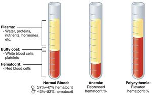 This diagram shows the normal components of blood and the alteration of these components in different scenarios.