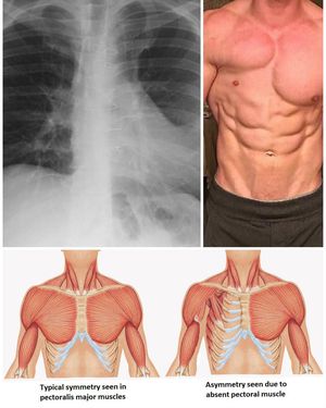 Seen here is a clinical picture and radiography of the chest showing poland's syndrome most common manifestation which is the absence of pectoralis muscles. Poland syndrome is a congenital defect in which there is hypoplasia or aplasia of pectoralis muscle most commonly major followed by minor, ipsilateral 2nd to 5th ribs, or ipsilateral breast or nipple. Other clinical manifestations include small hand and brachysyndactyly, simian crease of affected extremity. The condition is benign and depending on the degree of involvement of the upper extremity may be asymptomatic. Cosmetic reconstructive surgery may be considered (e.g. breast implant)