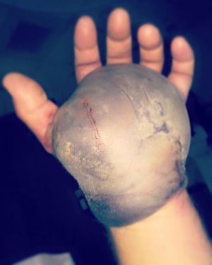 This photo was uploaded by a country star Kevin Fowler of his friend's hand that was bitten by a rattlesnake. Fowler added that his friend is still going through many surgeries and rehab.
