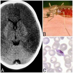 Malaria is an infection caused by protoza plasmodium. There are 4 species of plasmodium, falciparum, vivax, ovale, and malariae. Transmission is by Anopheles mosquito(Figure.B).»Symptoms of malaria are:-1.Cyclic fever at 48-72 hour intervals with chills.2.Hemolytic anemia(Figure.C)3.Splenomegaly (After 4 days of symptoms)4.Hyperventilation5.Agitation5.Bleeding»Complications of malaria are:-1.Cerebral malaria(Figure.A)2.Renal failure 3.Acute tubular necrosis4.Noncardiogenic pulmonary edema»Treatment of malaria is:-1.Cholorquine2.Primaquine3.IV Quinidine: For severe infections