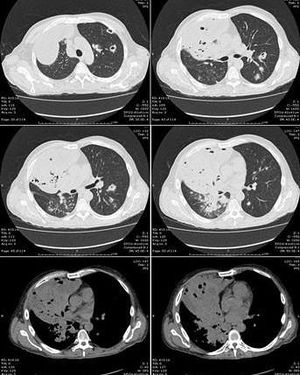 This chest CT Scan shows cavitary formation caused by the nocardia infection.Nocardiosis is an infection caused by fungus like bacteria called nocardia. It can produce two types of infections either pulmonary or cutaneous. In Pulmonary Nocardiosis there will cavitary formation that is sometimes misdiagnosed with TB, with Immunocompromised patients being in high risk. In Cutaneous Nocardiosis there will be cellulitis with abscess formation that is usually caused by traumatic implantation. Treatment of both types is Sulfonamides or TMP-SMX.