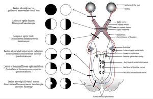 These are the most common visual field lesions:- -->Central scotoma cause: macular degeneration-->Right anopiacause: central retinal artery/vein occlusion, optic neuritis-->Bitemporal hemianopiacause: pituitary adenoma, craniopharygioma-->Left homonymous hemianopiacause: internal carotid arteryaneurism-->Left upper quadrantic anopiacause: right temporal lesion due to occlusion of MCA-->Left lower quadrantic anopiacause: right parietal lesion due to occlusion of MCA-->Left hemianopia with macular sparingcause: PCA occlusion.macula spare is due to bilateral projection to occiput and collateral blood supply from MCA.