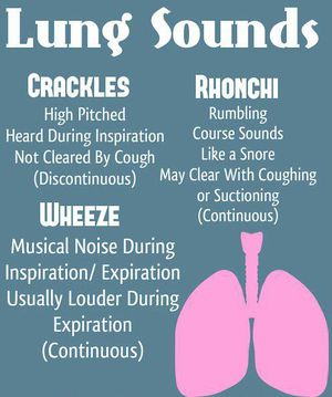 There are three abnormal lung sounds that can be heard during respiratory problems, they are crackles, rhonchi and wheezes.Crackles are high-pitched sounds heard during inspiration. It resembles the cracking or rattling sounds.Rhonchi, on the other hand, are rumbling course sounds heard during inspiration or expiration. It can be cleared when coughed out or when phlegm is suctioned out.Wheezes are musical-like sounds heard during inspiration or expiration. It resembles whistling sounds and it can be heard louder during expiration.