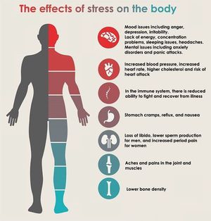 Stress is how the body react to challenges or stressors. Stress is a medical term for a wide range of strong external stimuli, both physiological and psychological, which can cause a physiological response called the general adaptation syndrome.Stress activates the sympathetic branch of the autonomous nervous system and the release of stress hormones including epinephrine, and cortisol. Sympathetic nervous output produces the fight-or-flight response, causing the body to divert the normal bloodflow. Less blood flows to the digestive system and other organs that do not assist in the stress condition, producing dry mouth, motor agitation, sweating, pallor, enlarged pupils and over the long term, insomnia. Stress is overcomed when the parasympathetic branch gets activated reversing the effects of sympathetic nervous system.