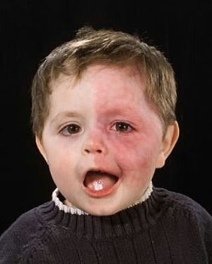 Shown here is a congenital port wine stains (nevus flammeus) which is seen in sturge weber syndrome.Sturge Weber Syndrome is a sporadic neurocutaneous disorder characterized by congenital port wine stains (aka nevus flammeus) classically in V1(ophthalmic distribution from trigeminal nerve) though may involve other distributions as well. Sturge weber syndrome can be associated with ipsilateral leptomeningeal capillary-venous malformation, or pheochromocytomas. Complications are glaucoma, seizures, hemiparesis, and mental retardation.Recent studies suggest that the reason behind this syndrome is a somatic mutation in GNAQ.