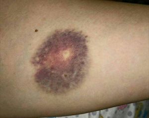 This can result from an I.V injection or a cannula. It is a common internal bleeding that occurs from escaping the vein leaving it ruptured.It can disappear it's own without any interfere, Some cases you may need to apply warm water on the affected area for several times, but most of the cases need topical preparations that may be made up of Aescin. Aescin is an agent that acts as an anti-edamatous, anti-inflammatory and pain reliever. One of these common used preparations is REPARIL®-Gel (Aescin 1g, and Diethylamine salicylate 5g)