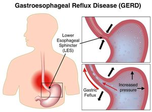 This picture shows the mechanism behind gastric reflux.GERD is caused by transient lower esophageal sphincter relaxation. Other causes are pregnancy, hiatus hernia, increaseed gastric acidity, obesity, or decreased esophageal motility. Symptoms of GERD are heartburn lasting for more than half an hour after food, regurgitation, and dysphagia. Treatment is by life style modifications (Don't lie down after eating, avoid spicy food), medical treatment starts with H2 blockers such as ranitidine, then proton pump inhibitors such as omeprazole can be used. Surgical treatment is by a procedure called nissen fundoplication.