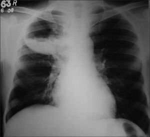 This X-Ray shows multiple air-fluid levels in the upper right lobe which is a characteristic of lung abscess.Lung abscess is suppurative inflammation of lung tissue with normal parenchyma, most commonly affects right lung. This results from autodigestion of the lung tissue by the inflammatory cells. Causes of lung abscess can be aspiration of oropharyngeal material, cancer, or bacterial pneumonia. The most common bacteria to be involved are bacteroides, peptostreptococcus, and fusobacterium. Symptoms of lung abscess include fever, malaise, cough with foul smelling sputum, weight loss and night sweats.