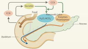 Pancreatic secretions contain aqueous component (HCO3) and enzymatic component (to digest carbohydrates, proteins, and lipids). Formation of the pancreatic secretions takes place in the exocrine portion, acinar cells secrete the enzymatic component, while centroacinar and ductal cells secrete and modifies the aqueous component to finalize it as an isotonic secretion. The most important physiological factor to determine the pancreatic secretion is the flow rate. High flow rate results in high HCO3- and low Cl-, while Low flow rate results in Low HCO3- and high Cl- composition.