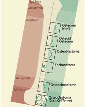 This diagram shows different locations of different bone tumors with their shape. The most common benign bone tumor is osteochondroma. Evaluation of these tumors is by X-Ray, or Biopsy.