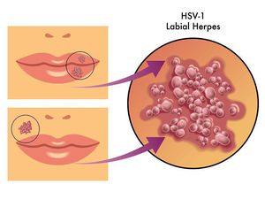 This lesion appears as vesicles mostly near to the mucocutaneous junctions. HSV-1 occurs most commonly in the lips, other places are nose, face, and genital regions. The lesion tends to heal without fibrosis which will not leave any scars behind. Treatment is by using topical or oral acyclovir that will inhibit herpes virus DNA polymerase.