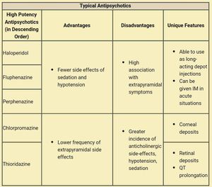 These drugs are the old generation of the antipsychotics, they are strong D2 receptor antagonist. Both typical and atypical drugs target dopaminergic neurons. This figure shows the typical antipsychotics with their features.