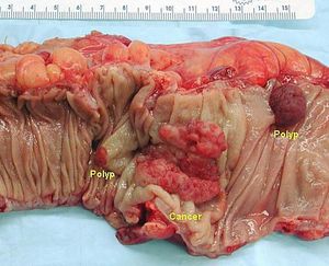 Carcinoma of colon is the most common cancer of GIT. Peak incidence in 70-80, with 7% under age of 40. 30% of the cases are associated with polyps. Rectal cancer is more common in males, while colonic cancer is more common in females. Risk factors for colorectal cancer are aging which is the dominant risk factor, dietary factors (High animal fat food, deficiency of vits A,C, & E, and selenium), alcohol increases colonic cancer, obesity, and smoking. Patients with familial adenomatous polyposis syndrome 100% will develop the cancer, other premalignant conditions are adenoma, hamartomas, ulcerative colitis > crohns disease, and schistosomiasis. Symptoms of colonic cancer are anemia, obstruction, dyspepsia, and appendicitis. Symptoms of rectal cancer are bleeding, altered bowel habit, tenesmus, pain, and bladder symptoms. Treatment is mostly by surgical resection with or without chemotherapy.