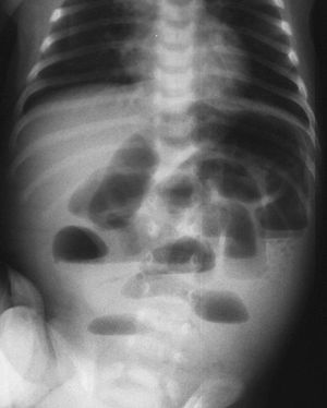 Intestinal obstruction could occur in small or larger intestine, the most common cause of all intestine obstructions is post-operative adhesions, but notice that the most common cause of large intestine obstruction is colorectal cancer in elderly people. Other causes of intestinal obstruction are henrias as femoral hernia carries the highest risk for obstruction, duodenal atresia, gallstones or paralytic ileus. Dehydration is common due to water remaining unabsorbed in the bowel or continuous vomiting. Symptoms are lack of flatus, constipation, high pitched bowel sound, nausea/vomiting, abdominal distention and tenderness. Diagnosis is by lab tests which will show elevated BUN, Hematocrit, Creatinine, LDH, CK, and in some cases WBC. This X-Ray shows dilated intestinal loops and ladder like appearence due to air-fluid levels.