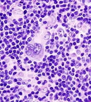 Hodgkin's lymphoma is neoplasm of large B lymphocytes (Reed Sternberg) cells. The most common subtype of Hodgkin's is nodular sclerosing which is more common in females. Symptoms are fever, chills, and night sweats. Biopsy is the test of choice and as you can notice in this histopathological picture a pair of owl-eyed nuclei which is a hallmarker for the diagnosis.