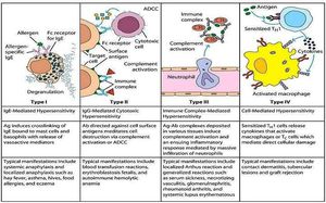 It is an autoimmune disease or excess response to foreign stimulus. Categorized by type of effector mechanism as types I, II, and III are antibody-mediatedtype, while type IV is T cell-mediated. This diagram shows the differences between the four types.