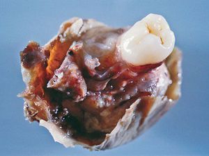 It is a tumor of brachial cleft cells that contain ectoderm, endoderm, mesoderm. Note that dermoid cyst is a teratoma made out of ectodermal derivatives (teeth, skin, hair). Usually found in anterior mediastinum, 15% are malignant and they invade the surrounding tissues. Evaluation is by CT scan, X-ray shows teeth or calicifications, AFP, CEA are tumor markers. Treatment is Surgical resection with preoperative chemotherapy if malignant. This gross picture shows mass found in the mediastinum on routine imaging and was removed, note the mixed tissue with teeth.