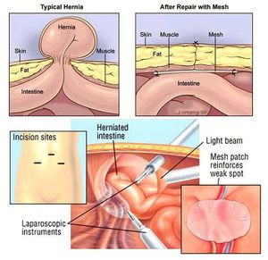 It is basically protrusion of fat or intra-abdominal organs through a weakness or defect in the layers of the abdominal wall. The most common types of hernia are inguinal (inner groin), incisional (resulting from an incision), femoral (outer groin), umbilical (belly button), and hiatal (upper stomach). The treatment of all hernias is surgical repair which can be open or laparoscopic. Nowadays, laparoscopic repair is preferred in which a large mesh is placed within the abdomen which seals the defect and prevents the hernia from forming again.